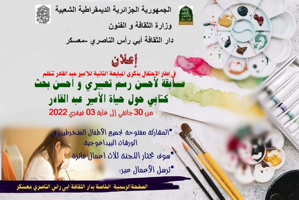 الواجهةإعلان عن مسابقة لأحسن رسم و بحث كتابي حول الأمير عبد القادر by adminفبراير 1, 2022فبراير 1, 202201062 Share1