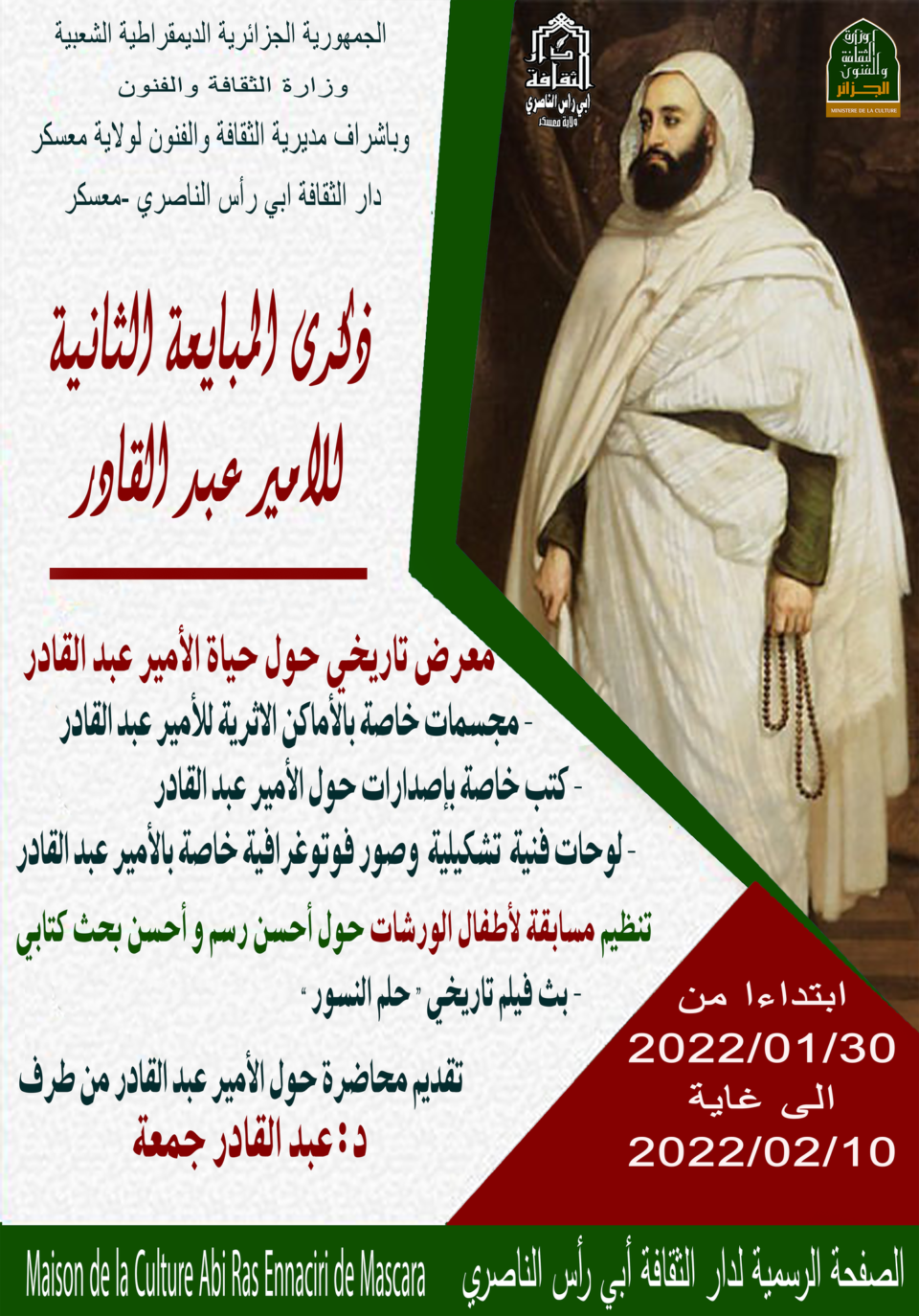 | إبتداءً من يوم 30/01/2022 إلى غاية 10/02/2022 | معرض تاريخي حول حياة الأمير عبد القادر يحوي. – مجسمات خاصة بالأماكن الأثرية للأمير عبد القادر – كتب خاصة بإصدارات حول مقاومة الأمير عبد القادر. -لوحات للفنون التشكيلية و صور فوتوغرافية خاصة بالأمير عبد القادر. – توزيع مطويات حول حياة الأمير عبد القادر. – بث صور لأدوات ومستلزمات الأمير عبد القادر. |