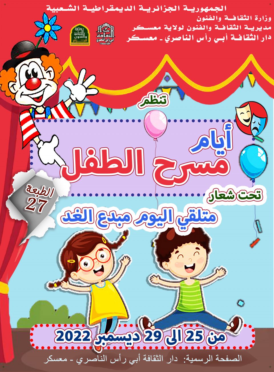 النشاطات الثقافية الواجهةالأيام الوطنية لمسرح الطفل في طبعتها السابعة و العشرون تحت شعار:”متلقي اليوم مبدع الغد” من 2022/12/25 إلى 2022/12/29 by adminديسمبر 20, 2022ديسمبر 20, 20220663 Share1